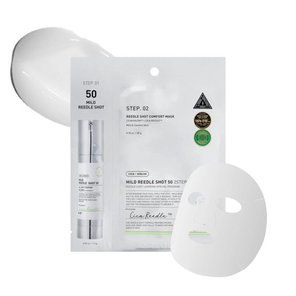 [STEP 01 - Mild Reedle Shot 50] Aqua, Dipropylene Glycol, Glycerin, Niacinamide, Butylene Glycol, Macadamia Ternifolia Seed Oil, 1,2-Hexanediol, Ethylhexyl Palmitate, Sodium Polyacrylate, Sodium Acrylate/Sodium Acryloyldimethyl Taurate Copolymer, Polyisobutene, Glycereth-26, Silica, Ethylhexylglycerin, Caprylyl Glycol, Adenosine, Sodium Hyaluronate, Caprylyl/Capryl Glucoside, Sorbitan Oleate, Centella Asiatica Extract, Glyceryl Glucoside, Xanthan Gum, Aloe Barbadensis Leaf Extract, Glucose, Astaxanthin, Propolis Extract, Asiaticoside, Madecassoside, Madecassic Acid, Asiatic Acid [STEP 02 - Reedle Shot Comfort Mask] Aqua, Glycerin, Niacinamide, Butylene Glycol, Dipropylene Glycol, 1,2-Hexanediol, Betaine, Hydroxyacetophenone, Hydroxyethyl Urea, Diethoxyethyl Succinate, Panthenol, Ammonium Acryloyldimethyltaurate/VP Copolymer, Allantoin, Arginine, Carbomer, Ethylhexylglycerin, Xanthan Gum, Hydroxyethyl Acrylate/Sodium Acryloyldimethyl Taurate Copolymer, Adenosine, Disodium EDTA, Sodium Polyacrylate, Sorbitan Isostearate, Centella Asiatica Extract, Betula Alba Juice, Houttuynia Cordata Extract, Silica, Sodium Hyaluronate, Hyaluronic Acid, Asiaticoside, Asiatic Acid, Madecassic Acid, Madecassoside, Propolis Extract